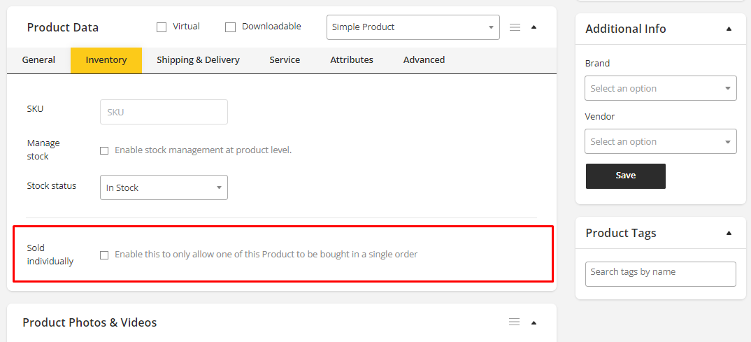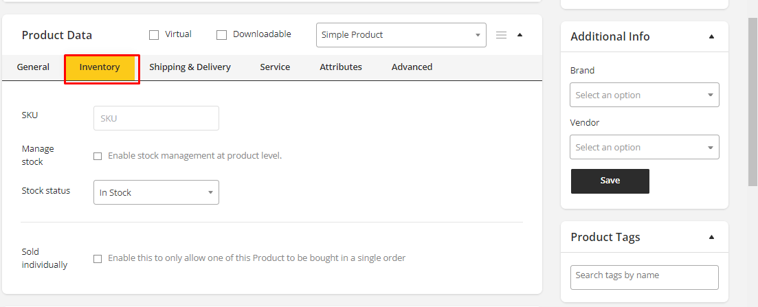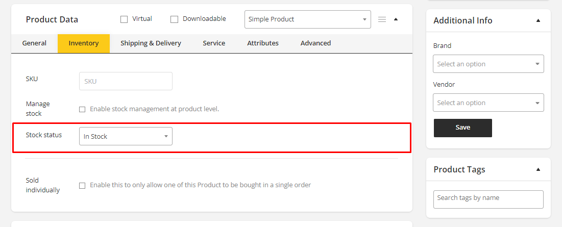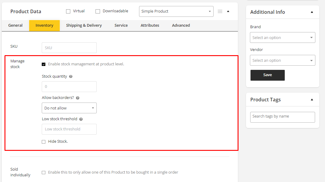 Enable Manage Stock must be selected in Products Inventory; otherwise, only the ‘Stock status’ option is visible in the Product Data Inventory section.