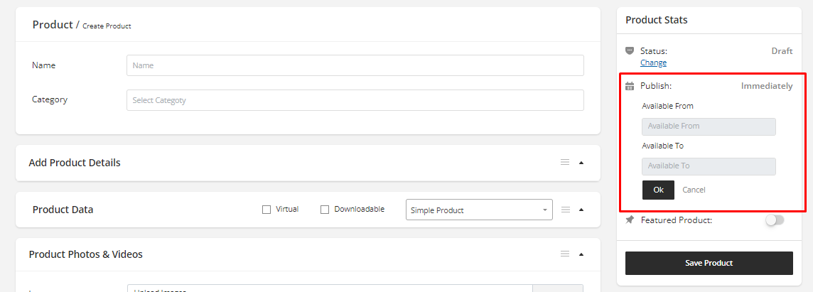 - Publish: You can publish the product immediately if you do not select any schedule and it will be as published product to website until you delete it. You can also select a schedule to the product which will indicate the product's published time.