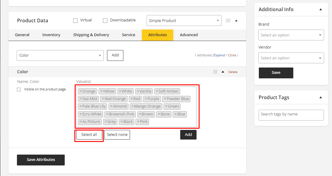 To select value to that attribute click on the value select box or to select all the attributes at once, click on Select all.