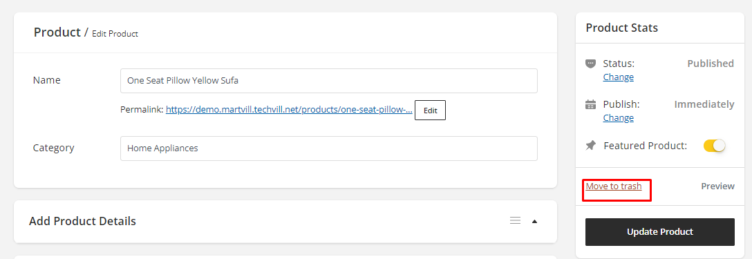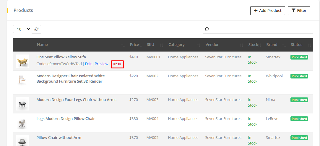- Hover on a product which you want to delete, Trash option will be visible. Click on it.