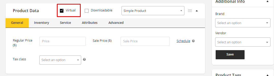 - Virtual: a product that does not need shipping. For example, a service, an appointment. This disables all shipping related fields such as shipping, dimensions. A virtual product will also not trigger the shipping calculator in cart and checkout.