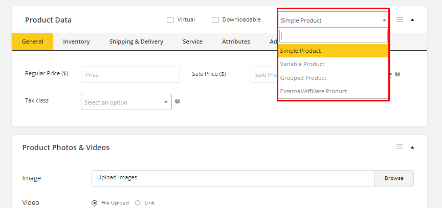 - Variable: a product that includes variations, each of them may have a different SKU, price, stock option, etc. For example, a dress available in different colors and/or sizes.