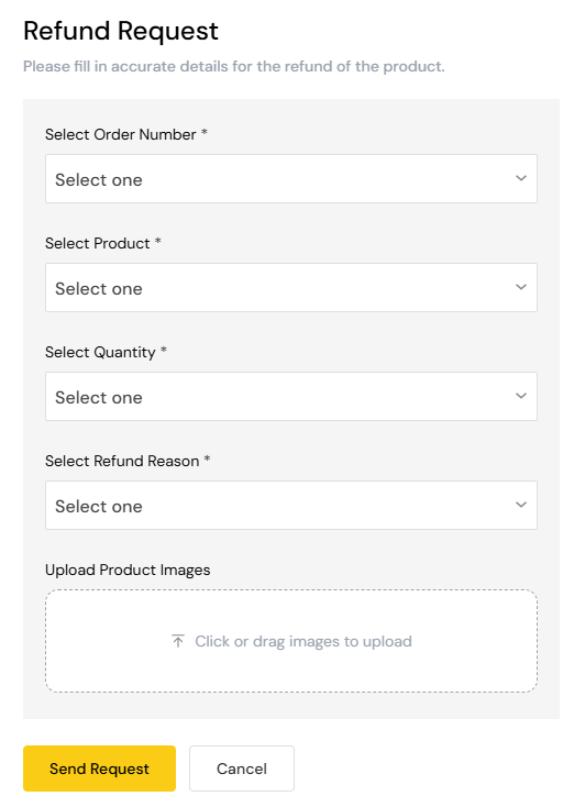 A Refund request form will appear. Select your order number from the dropdown, then select your product, quantity and reason from the dropdown list. Images can be added but not more 5 images.