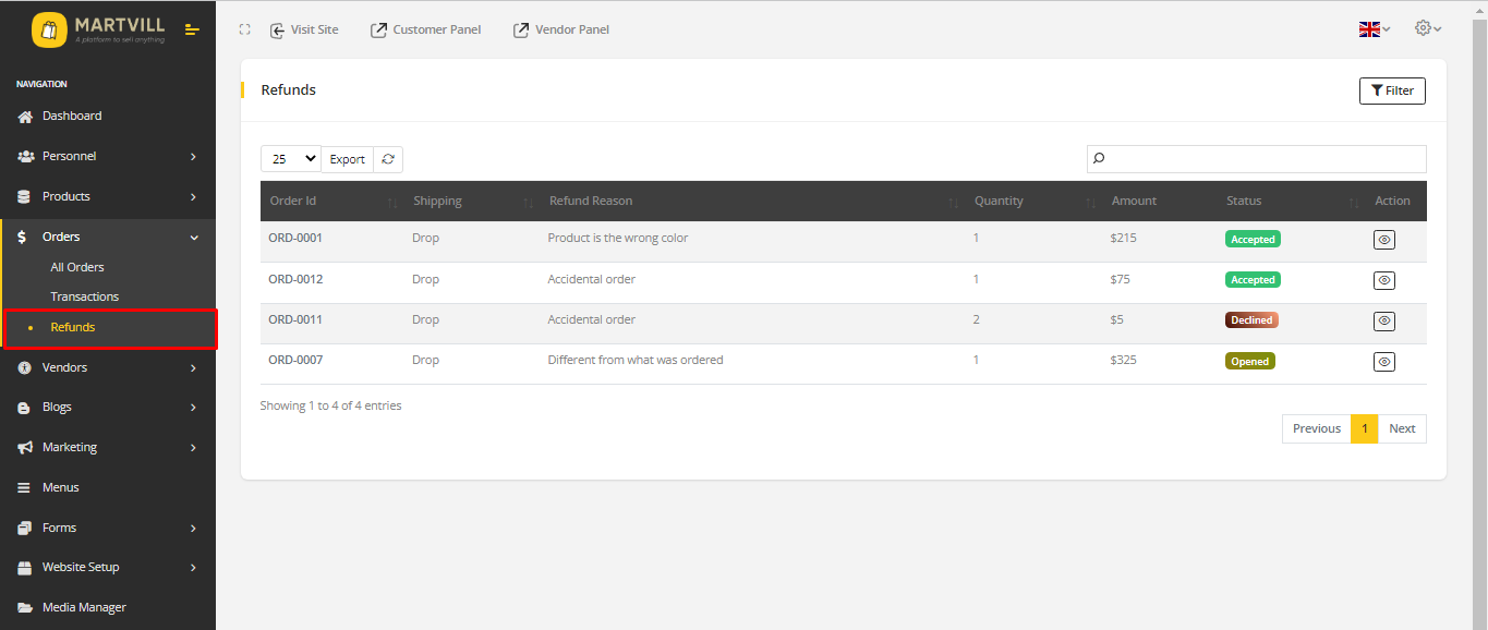 Go To MartVill Dashboard > Orders > Refunds from sidebar. A refund list will appear. Click on the view icon to view the details.