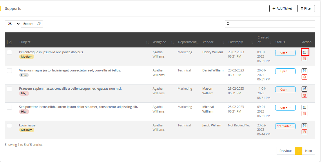 - When a ticket is created, Vendor can reply to the ticket. To view the details of the ticket by clicking on the ticket Subject from ticket list.