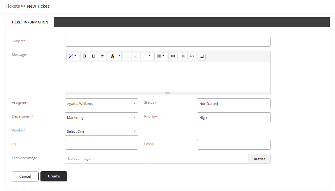 - Add the Vendor who is related to the ticket. Email and To field will automatically completed when Vendor is added.