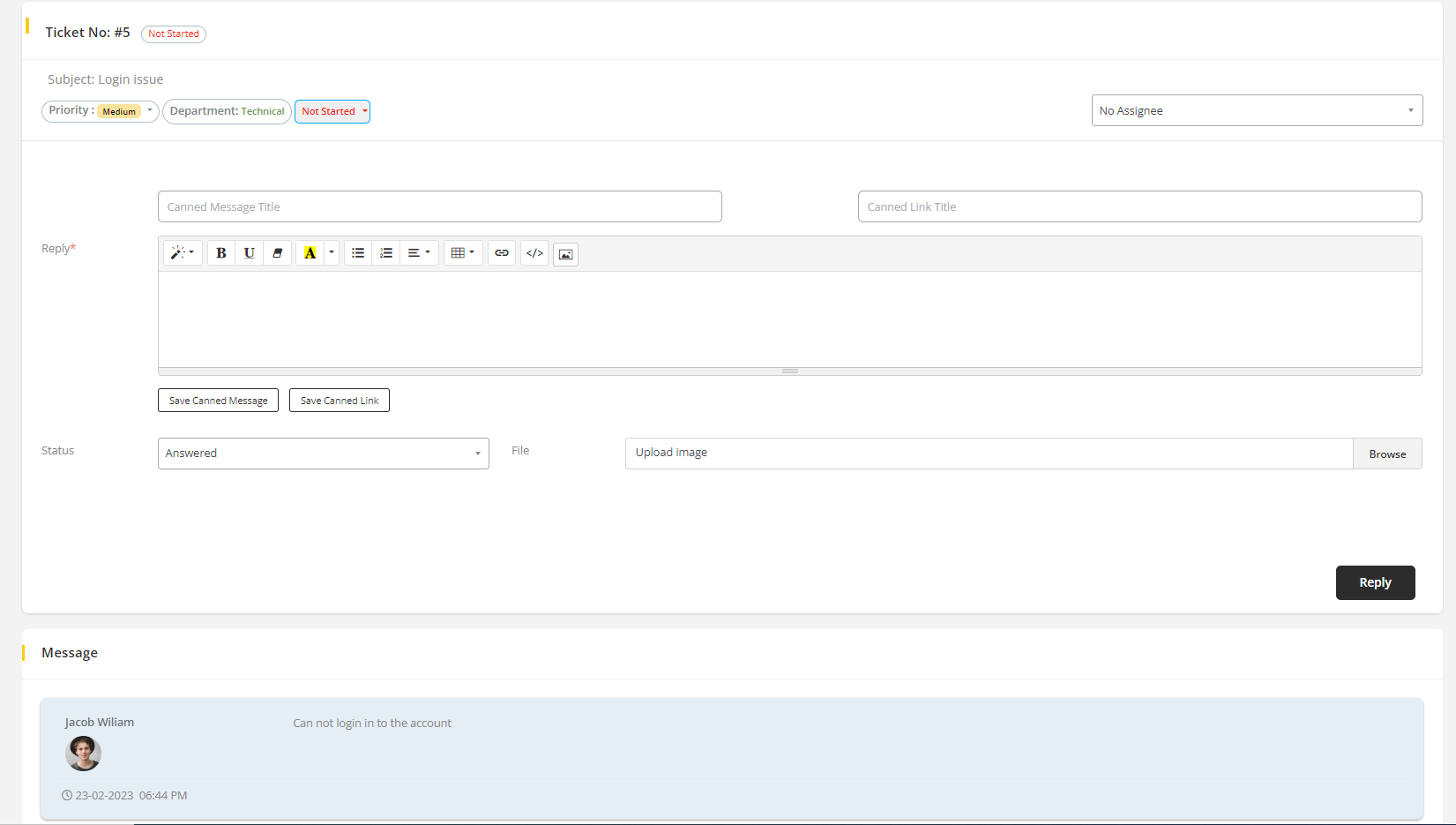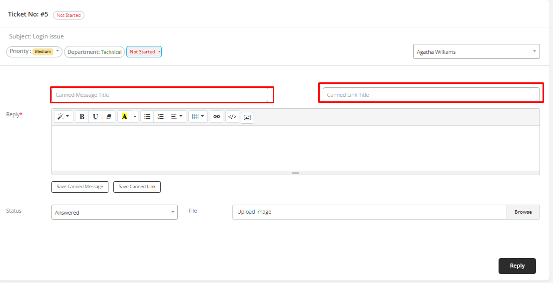 - Admin can reply in reply box and That reply can be Saved for later use. To save the reply, enter a title in the Canned Message Title and if you want to save a link from the reply, enter a title to Canned Link Title.