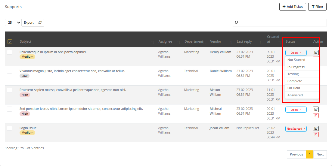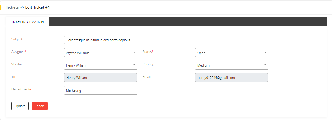 - Admin can edit Subject, Priority, Status, Assignee, Department and Vendor. Update the changes by clicking on Update