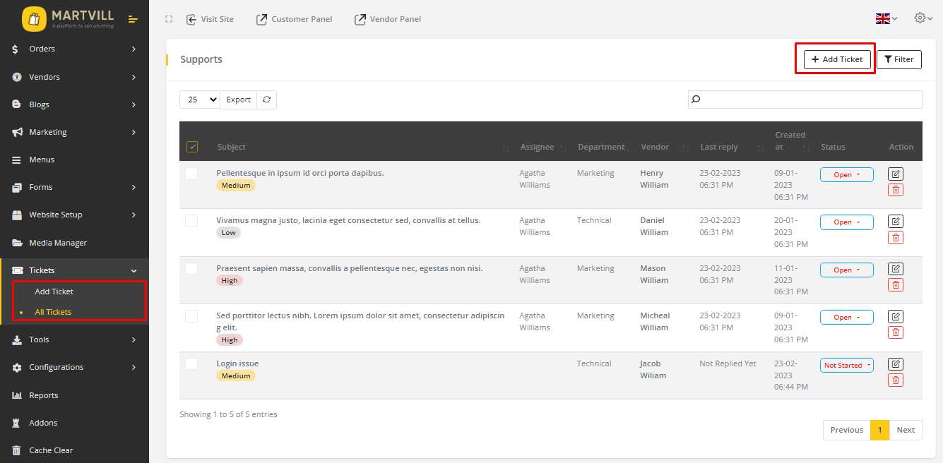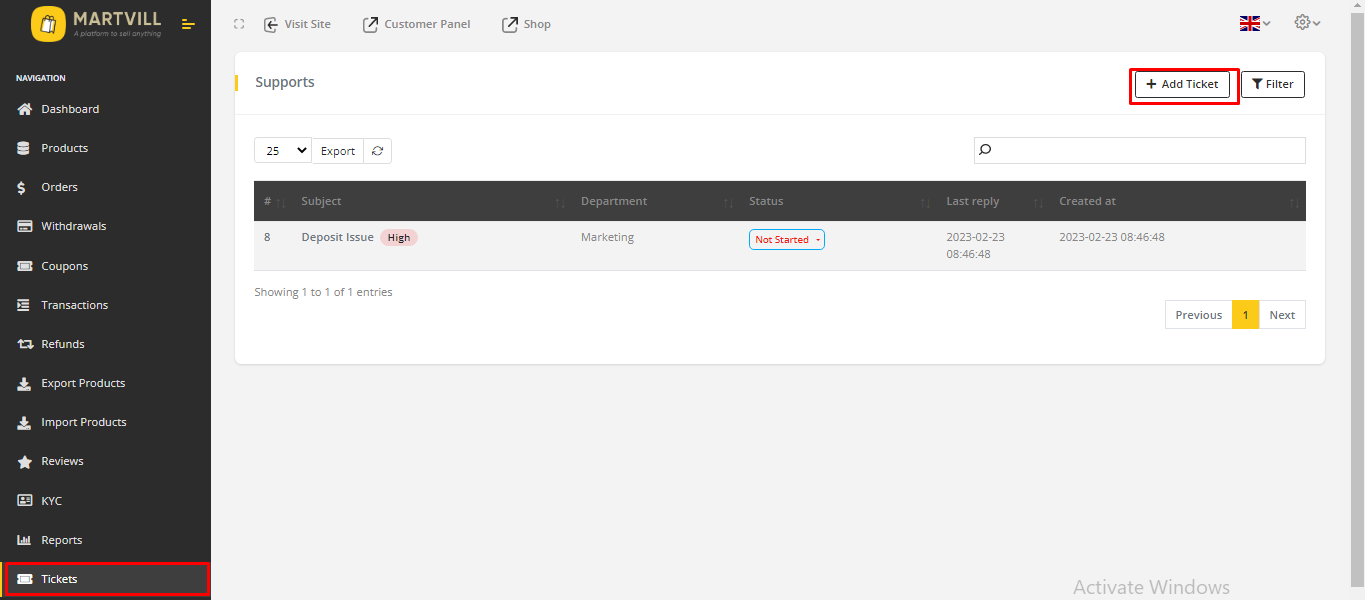 - Go to MartVill Dashboard > Tickets > Add Tickets or MartVill Dashboard > Tickets > All Tickets > Add Ticket