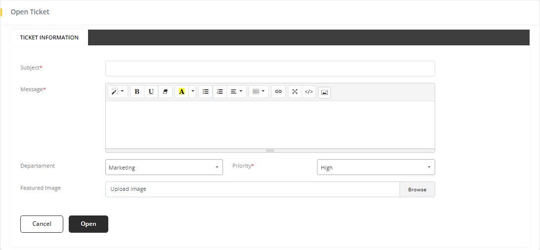 - Click on Open to save the ticket. Admin will receive an email that a ticket is created.
