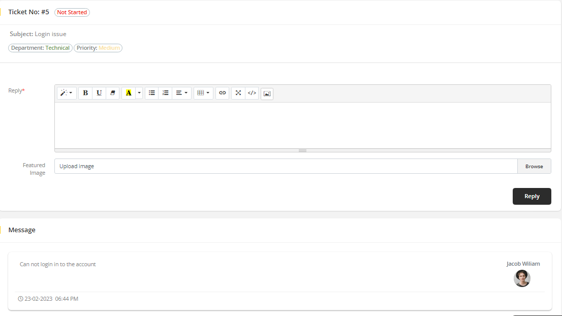 - When a ticket is created, Admin can reply to the ticket. To view the details of the ticket by clicking on the ticket Subject from ticket list.