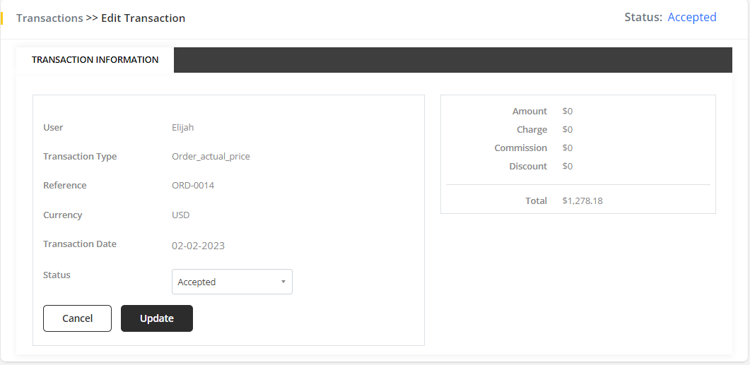 - Status: it shows in which status the transaction is in, Pending, Accepted or Rejected.