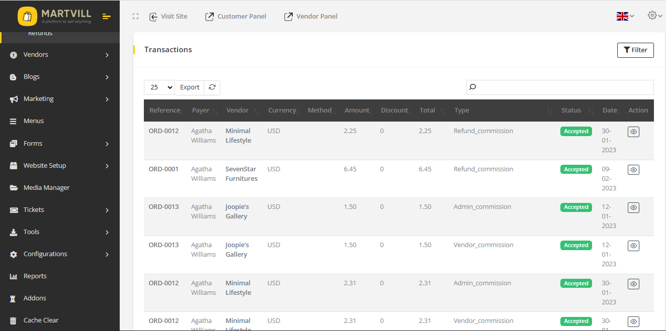 Go to MartVill Dashboard > Orders > Transaction from the sidebar. The transactions that are happened so far will be shown in a list.