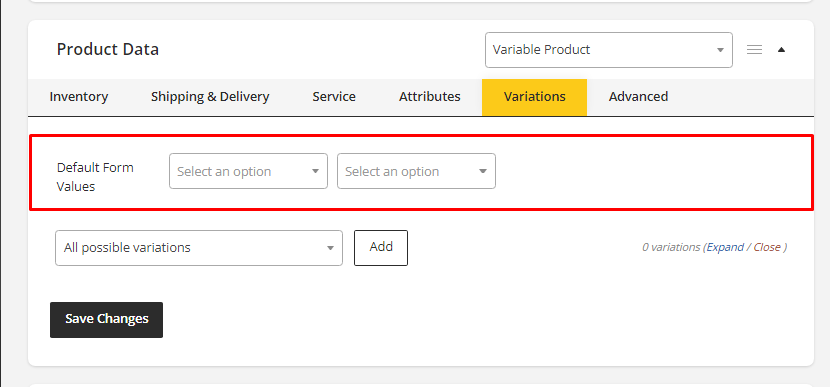 Select the default form values if you want a specific variation to be pre-selected when a user accesses the product page. In this case, the Add to Cart button will automatically appear on pages for variable products.