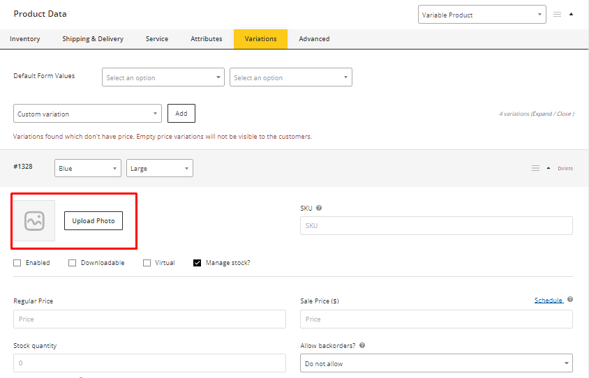 - Manage Stock - Inventory will be managed for this variation.