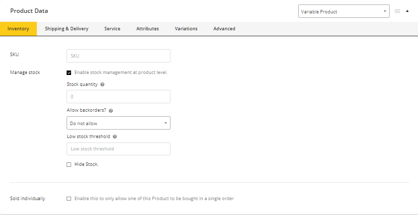 - Sold Individually – Allow only one to be sold in one order. (For the product itself, this setting is used. A particular variation cannot be restricted to sell one per order.)