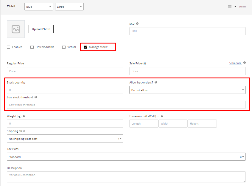 - Stock quantity – allows you to specify the variation's current stock level when Manage stock is chosen.