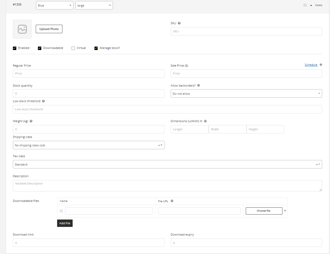 - Weight – Weight for the variation, or to use the product’s weight, left blank on variation.