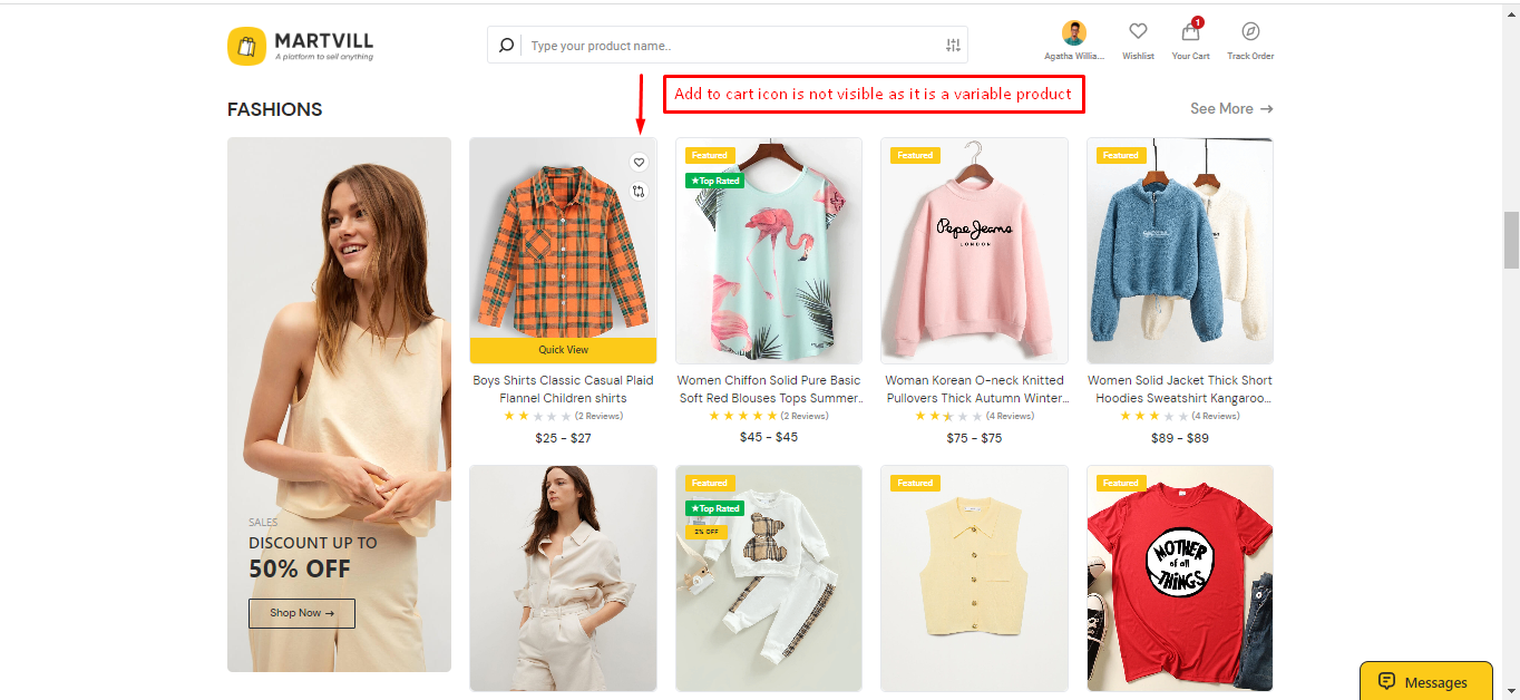 In the homepage or other page, Add to Cart icon does not display when hovering over a product because a variation must be chosen before adding the variation to the cart.