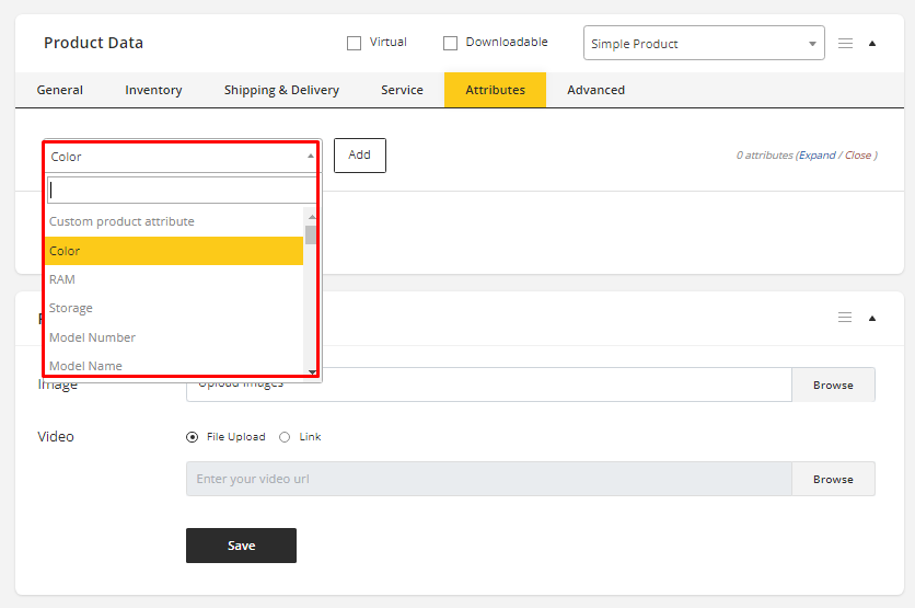 See Simple Product's Attribute section to add Global or Custom Attribute to the product.