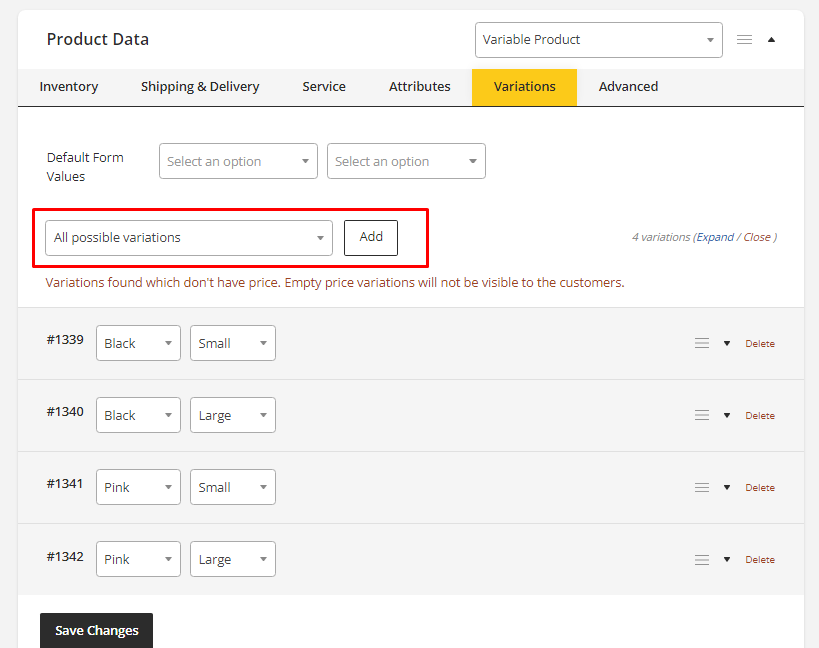 - Save all the information of the variations by clicking Save Changes.